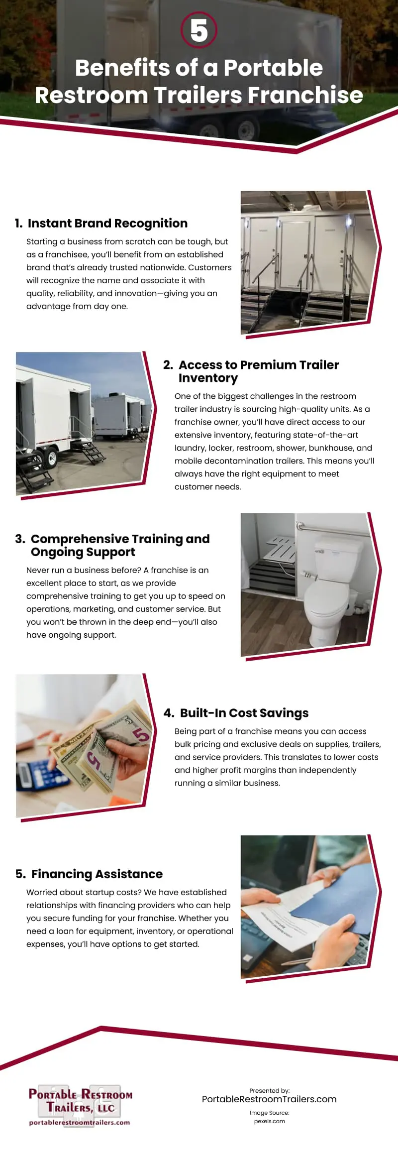 If you’ve ever dreamed of owning a business, setting your own schedule, and stepping into a high-demand industry, franchising with Portable Restroom Trailers offers a clear path to success. This opportunity gives you more than a business—it gives you a head start, with instant brand recognition that builds trust from day one. As a franchisee, you gain direct access to a premium inventory of state-of-the-art mobile units including restrooms, showers, laundry, and decontamination trailers, ensuring you can meet any client need. You don’t need prior business experience, either—comprehensive training and ongoing support will guide you every step of the way, from marketing to operations. As part of our network, you’ll benefit from built-in cost savings through bulk pricing and exclusive deals, increasing your profit potential. Plus, we’ll help you get started with financing assistance through our trusted lending partners, making it easier to fund your launch and early growth. Joining the Portable Restroom Trailers family is more than an investment—it’s a chance to take control of your future and grow in a booming industry.