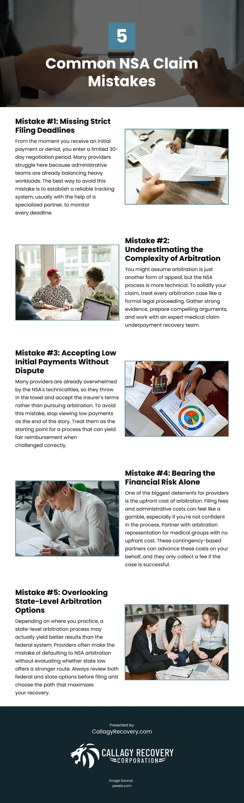 Navigating NSA claims can be a complex and time-sensitive process, and even experienced providers risk losing revenue due to avoidable errors. The most common pitfalls include missing strict filing deadlines, underestimating arbitration complexity, and accepting low payments without dispute. Once an initial payment or denial is received, the 30-day negotiation window begins—and without a reliable tracking system, it’s easy to miss crucial dates. Many also treat arbitration like a standard appeal, but it requires legal-level preparation with solid documentation, persuasive evidence, and expert guidance. Accepting low initial payments without question can cost thousands, as these are often just starting points for negotiation. The financial risks of arbitration, including fees and administrative costs, can also discourage providers from pursuing valid claims, but partnering with contingency-based representation eliminates that burden. Additionally, overlooking state-level arbitration options can result in lower recoveries, as state systems sometimes offer more favorable conditions than federal ones. By avoiding these mistakes and working with experts who understand the intricacies of medical claim arbitration, providers can secure fair reimbursements, maintain compliance, and strengthen their practice’s financial foundation.