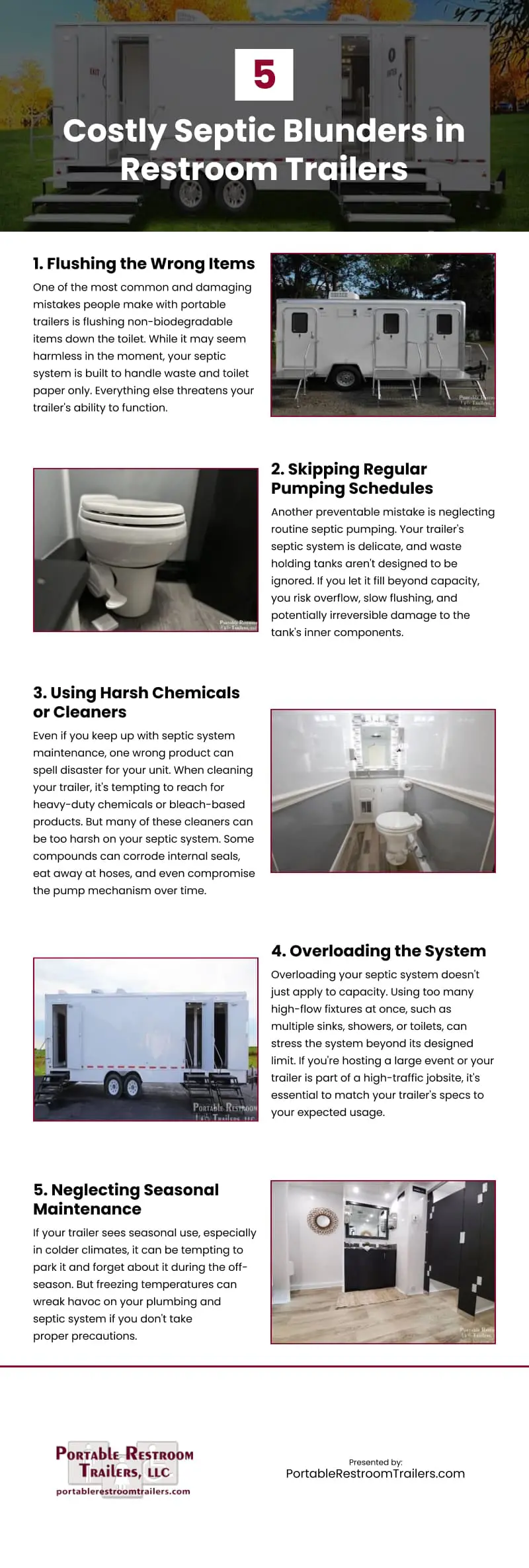 Keeping your trailer’s septic system healthy is essential for maintaining reliable sanitation, preventing costly damage, and ensuring your mobile restroom runs smoothly year-round. The biggest threats usually come from everyday habits, starting with flushing anything other than waste and toilet paper, which can clog lines, jam pumps, and overwhelm a system designed for biodegradable materials only. Ignoring routine pumping is another silent danger, since overfilled tanks lead to slow flushing, foul odors, overflow, and long-term damage that’s far more expensive than maintenance. Even your cleaning choices matter—harsh chemicals, heavy detergents, and bleach-based products can corrode seals, damage hoses, and weaken pump components, gradually eroding the system from the inside out. Overloading the system, whether by exceeding capacity or running multiple high-flow fixtures at once, puts stress on the tank and plumbing, especially during high-traffic events or busy job sites. And if your trailer sits unused during colder months, skipping seasonal prep leaves it vulnerable to freezing, cracking, and serious plumbing failures. With the right habits and proactive care, you can maintain a clean, functional, and stress-free septic system, protecting both your investment and your peace of mind.