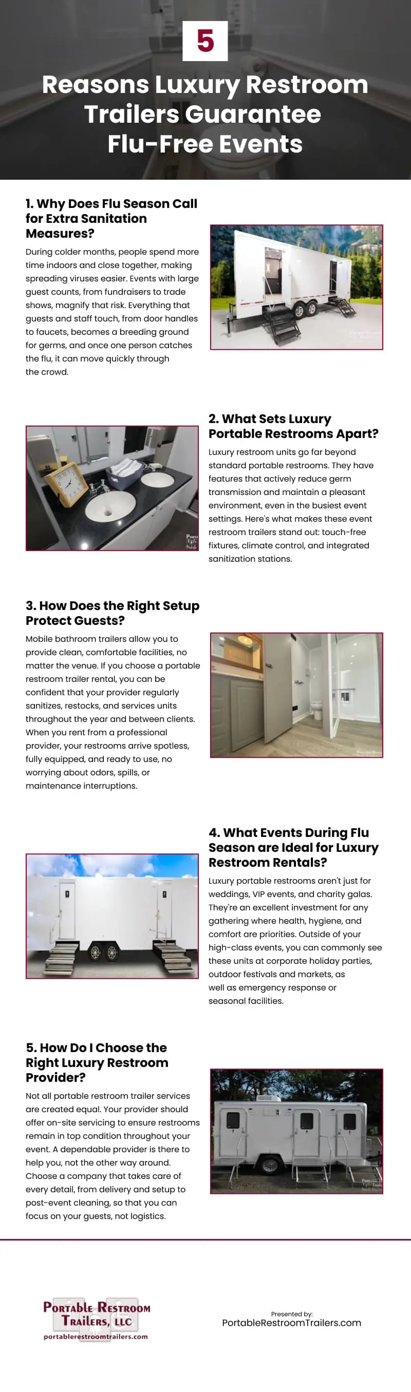 Flu season raises the stakes for event sanitation, especially when guests spend more time indoors and in close contact, increasing the spread of germs across high-touch surfaces. Choosing luxury portable restroom trailers helps protect attendees by offering touch-free fixtures, climate-controlled interiors, and built-in sanitization stations that significantly reduce transmission risks while keeping guests comfortable and clean. Unlike basic portable units, these high-end trailers arrive fully sanitized, well-stocked, and professionally maintained, ensuring a clean, odor-free, interruption-free experience throughout your event. They fit seamlessly into winter weddings, corporate gatherings, holiday festivals, outdoor markets, and even emergency response settings where hygiene and comfort are top priorities. A trusted restroom trailer provider handles delivery, setup, servicing, and post-event cleanup, giving you peace of mind and allowing you to focus on your guests rather than facility logistics. With a properly managed restroom setup, you enhance the overall event experience while reducing the likelihood of flu transmission among attendees. By prioritizing cleanliness, comfort, and proactive sanitization, luxury portable restrooms help you create a healthier environment, reinforce your commitment to guest safety, and keep your winter events running smoothly—even during peak flu season.