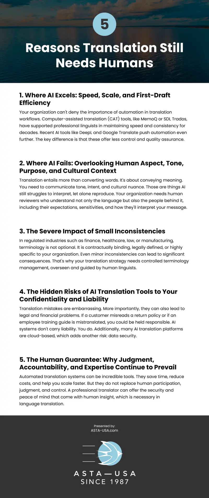 Automation has transformed translation with incredible speed and scale, allowing organizations to produce first-draft translations in seconds and manage large volumes of content efficiently. Tools like CAT platforms and AI-driven translators help maintain consistency and reduce turnaround time, making them valuable for internal workflows and early-stage drafts. But translation is more than swapping words between languages; it is about preserving meaning, tone, intent, and cultural context. This is where automation alone falls short. AI struggles to comprehend emotional nuance, brand voice, and the nuanced expectations of different audiences, which can result in messages that sound awkward, misleading, or even offensive. In regulated industries such as healthcare, finance, and law, even small terminology errors can carry serious legal and financial consequences. Confidentiality is another critical concern, as many AI tools rely on cloud-based systems that may expose sensitive data. When mistakes happen, AI carries no accountability—your organization does. Human translators bring judgment, cultural intelligence, and responsibility to the process, ensuring terminology is controlled, context is respected, and risk is minimized. The most effective translation strategy blends the efficiency of AI with the oversight of skilled professionals, delivering both speed and accuracy without sacrificing trust, compliance, or brand integrity.