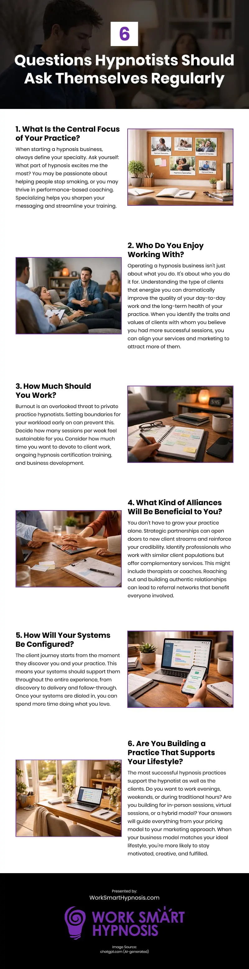 Starting and running a successful hypnosis practice requires both self-awareness and strategic planning to ensure fulfillment and long-term sustainability. It’s essential to define the focus of your practice by identifying what excites you most about hypnosis, whether it’s helping people quit smoking or working with performance-based coaching. Specializing in a specific area allows you to sharpen your messaging and streamline your training. Equally important is understanding the type of clients you enjoy working with; knowing the traits and values of clients who energize you can improve both your day-to-day work and the overall health of your practice. Setting clear boundaries on how much you work is crucial to avoiding burnout, so it’s important to decide on a sustainable workload that includes time for client sessions, ongoing training, and business development. Building strategic alliances with professionals offering complementary services, such as therapists or coaches, can help grow your client base and enhance your credibility. Additionally, configuring your systems to provide a seamless client experience from discovery to delivery will allow you to focus on what you love. Lastly, creating a practice that supports your desired lifestyle—whether through work hours, session formats, or business model—helps you stay motivated and fulfilled, setting the foundation for long-term success.