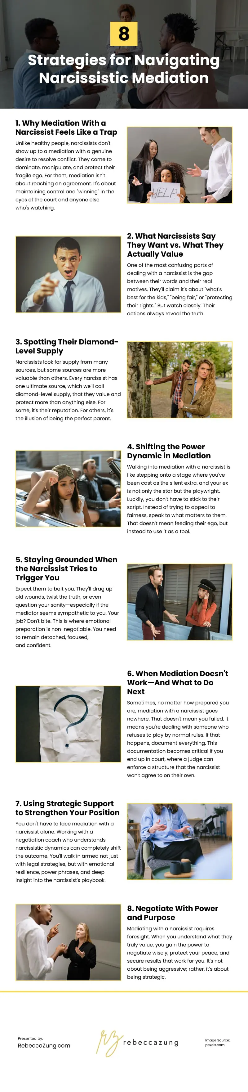 Mediating with a narcissist is far from a typical negotiation, as they prioritize dominating and manipulating rather than reaching a fair agreement. Their goal is to protect their fragile ego and maintain control, often claiming to want what’s best for others while their true motives lie elsewhere. Understanding a narcissist’s “diamond-level supply”—the one thing they value above all, such as their reputation or the image of being a perfect parent—can help you navigate the mediation process. Instead of trying to appeal to fairness, focus on what matters to them, using their ego strategically without feeding it. Emotional preparation is crucial, as they may attempt to provoke you by dragging up old wounds or distorting the truth. If mediation proves unproductive, it’s important to document everything for potential court proceedings, as some narcissists refuse to abide by normal rules. Enlisting the help of a negotiation coach familiar with narcissistic dynamics can enhance your position and provide you with emotional resilience and effective strategies. Ultimately, success lies in negotiating with insight and purpose, ensuring that you protect your peace while working toward outcomes that suit your needs.